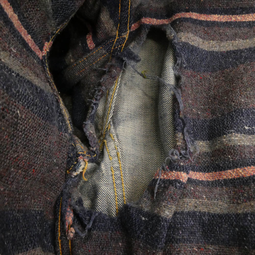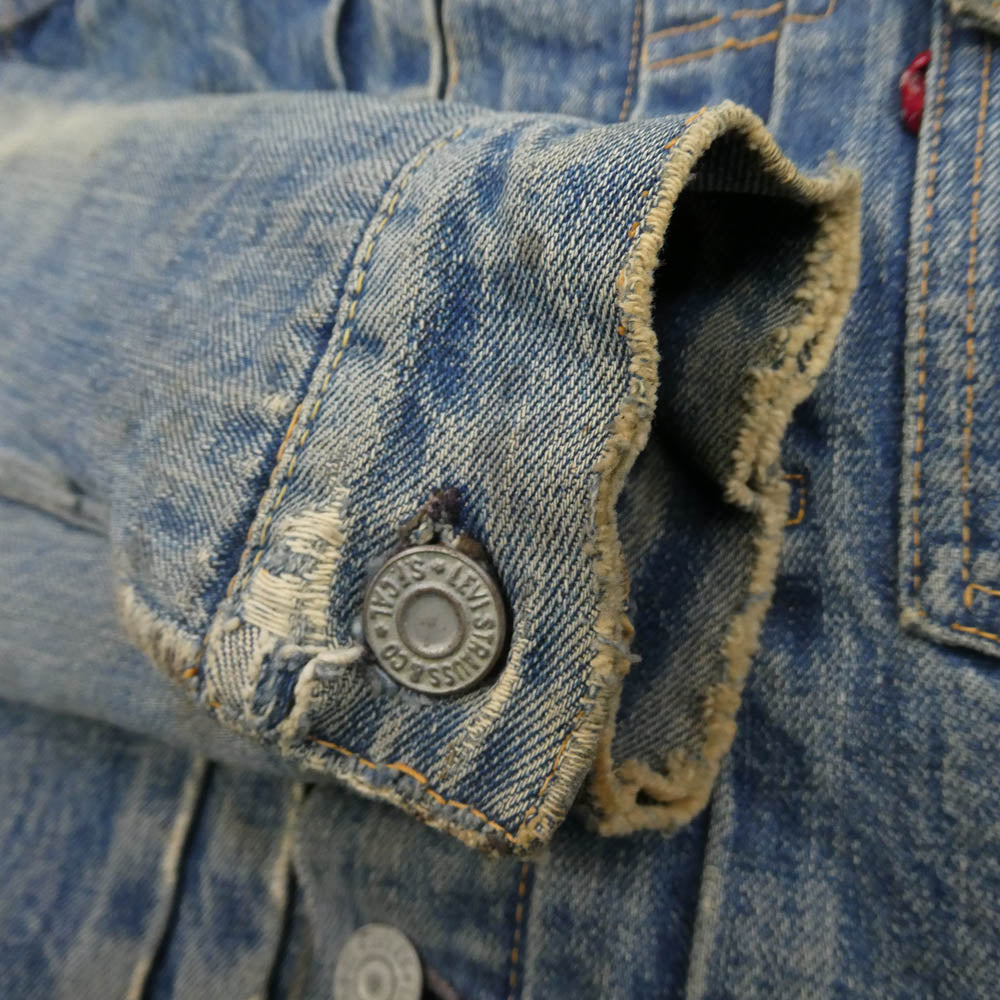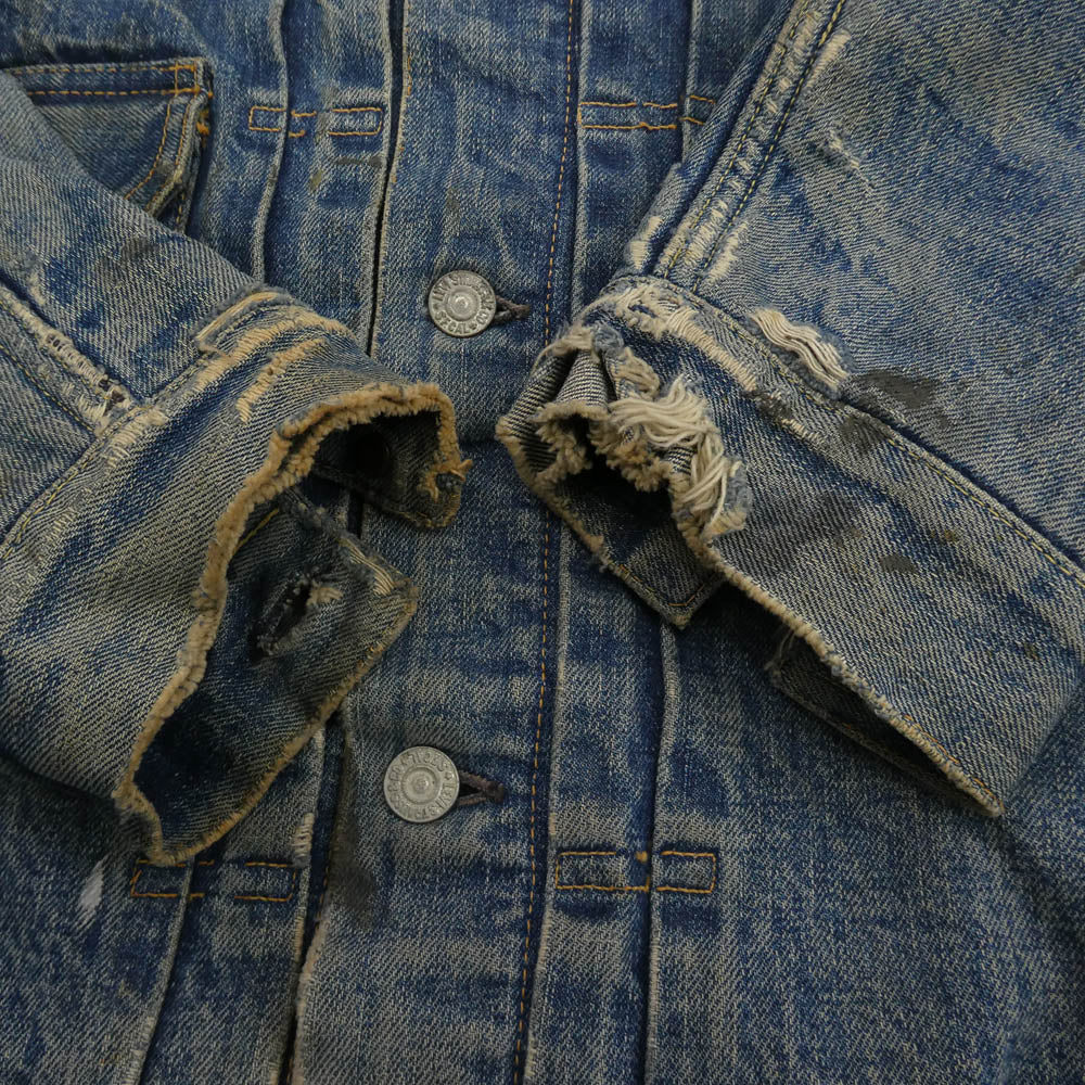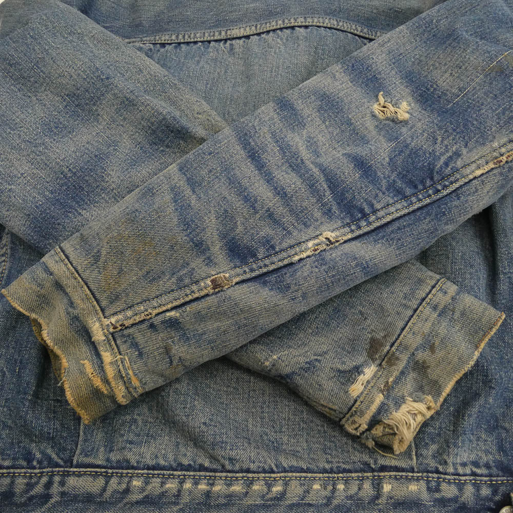 ※サイズ不明(実寸サイズをご参照ください) ※色残り3/10程度/ハギ付き/裏地ブランケット/ボタン裏刻印17/片面均等V/フラップポケット裏ライトオンス ※両袖、両腕、襟部分に非常に目立つ破れ、穴、ダメージ、リペアが広範囲にございます。 ※全体に目立つダメージ、シミ、汚れ、ステッチ抜け、強い使用感が広範囲にございます。 ※その他避けられないダメージ、使用感、全体的な色落ち・色褪せ、経年変化(汚れ、ステッチほつれ抜けダメージ一部)などがございます。※こういった年代中古商材にご理解のある方のみご検討下さい。完璧な商品状態をお求めの神経質な方はお控え下さい。 ※年代物ですので各部状態にご不安な方、神経質な方、細部まで完璧な状態をお求めの方はご購入をお控え下さい。※使用に伴う使用感、傷擦れ、素材特有の毛羽立ち、生地アタリ、汚れ、ほつれなどはございます。中古商材にご不安な方、完璧な商品状態をお求めの方はお控え下さい。 |