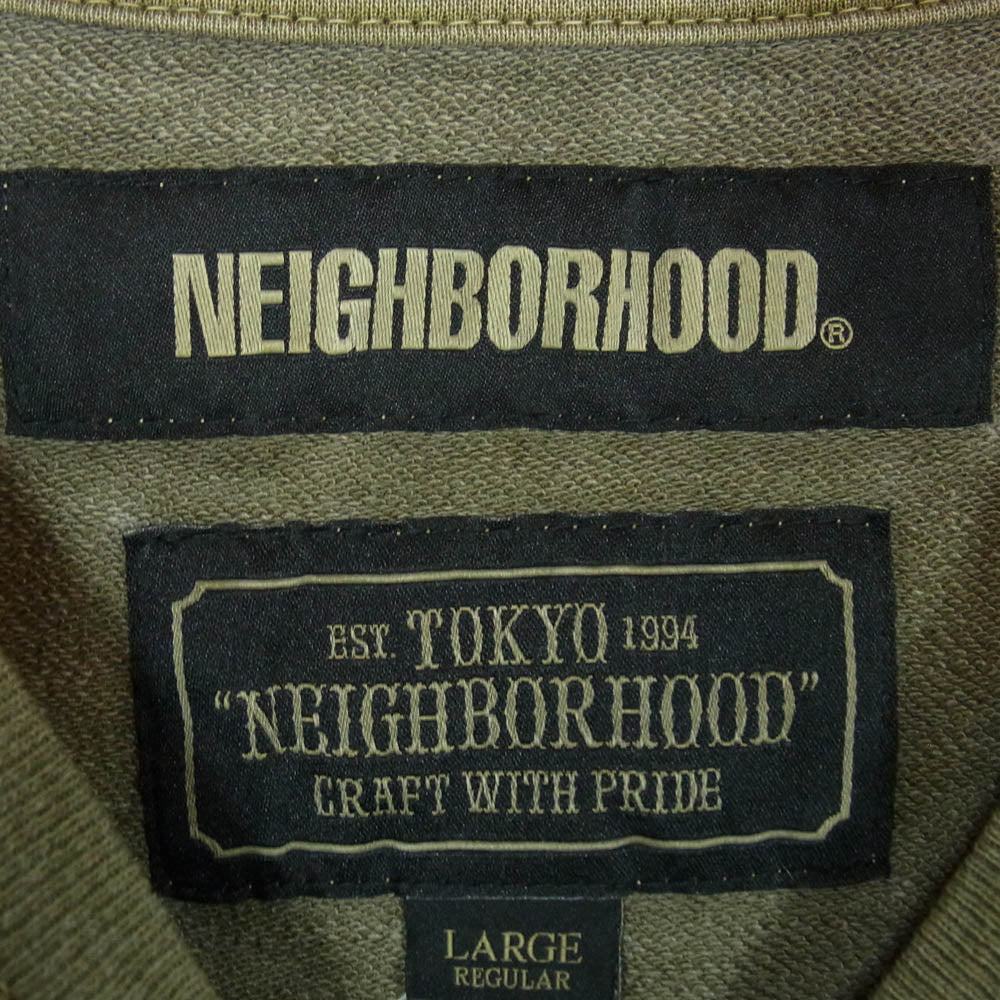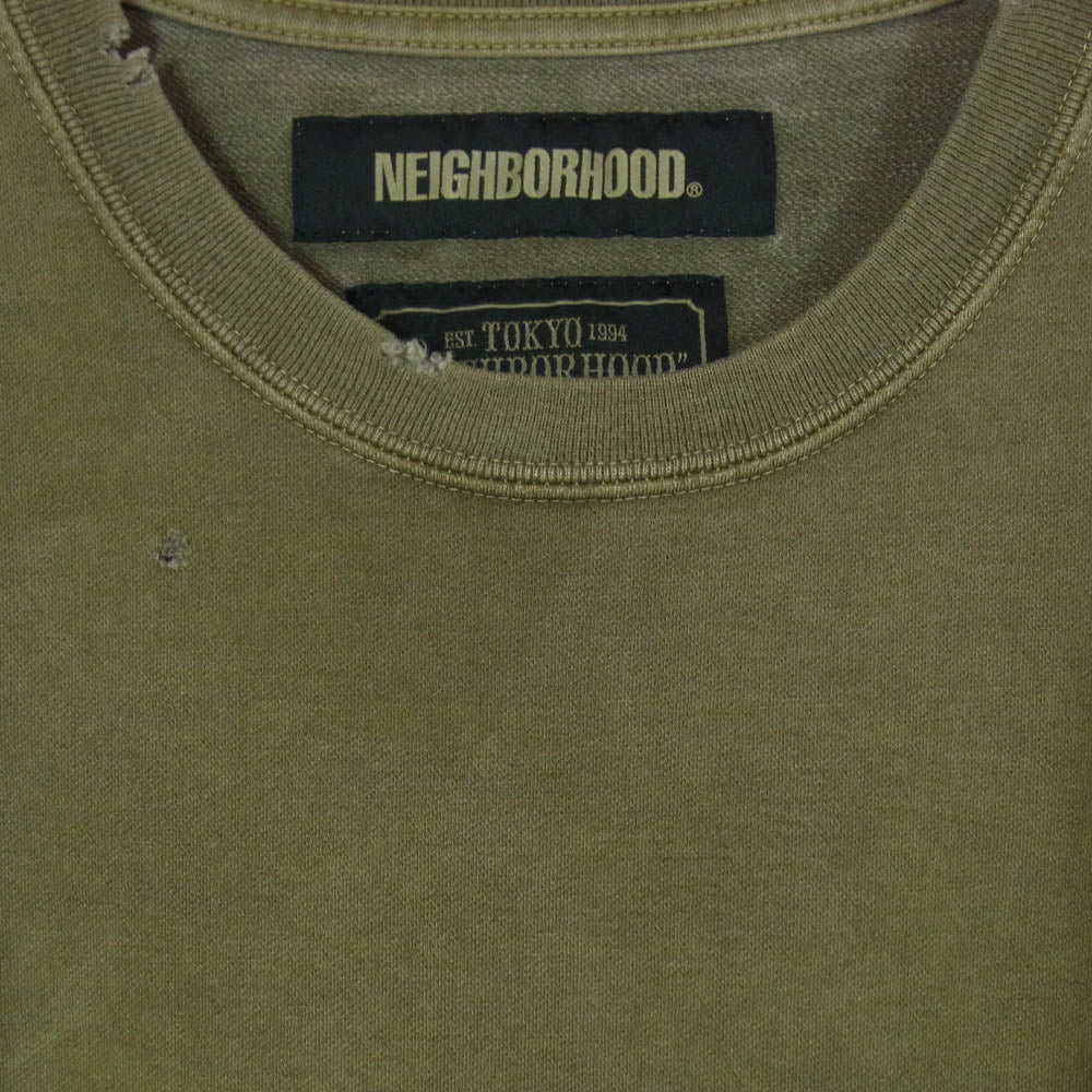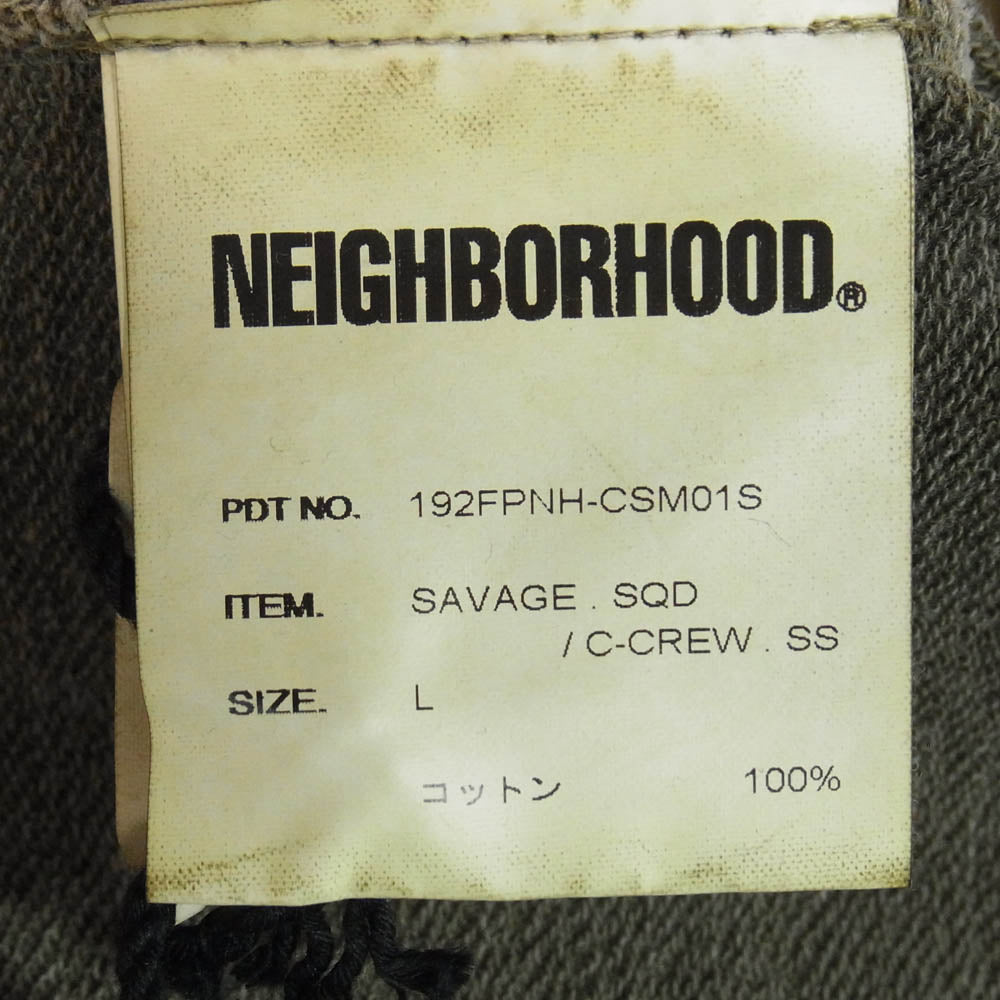 NEIGHBORHOOD ネイバーフッド 19AW 192FPNH-CSM01S SAVAGE SQD C-CREW SS ダメージ加工 ロゴ刺繍 クルーネック コットン半袖 Tシャツ カットソー 厚手 OLIVE DRAB L【新古品】【未使用】【中古】