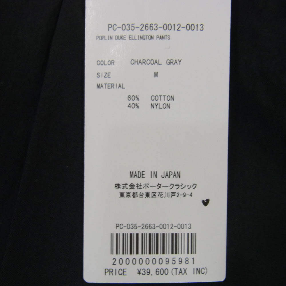 PORTER CLASSIC ポータークラシック 24SS PC-035-2663-0012-0013 POPLIN DUKE ELLINGTON PANTS テーパード ナイロン混 タック パンツ チャコール系 M【新古品】【未使用】【中古】