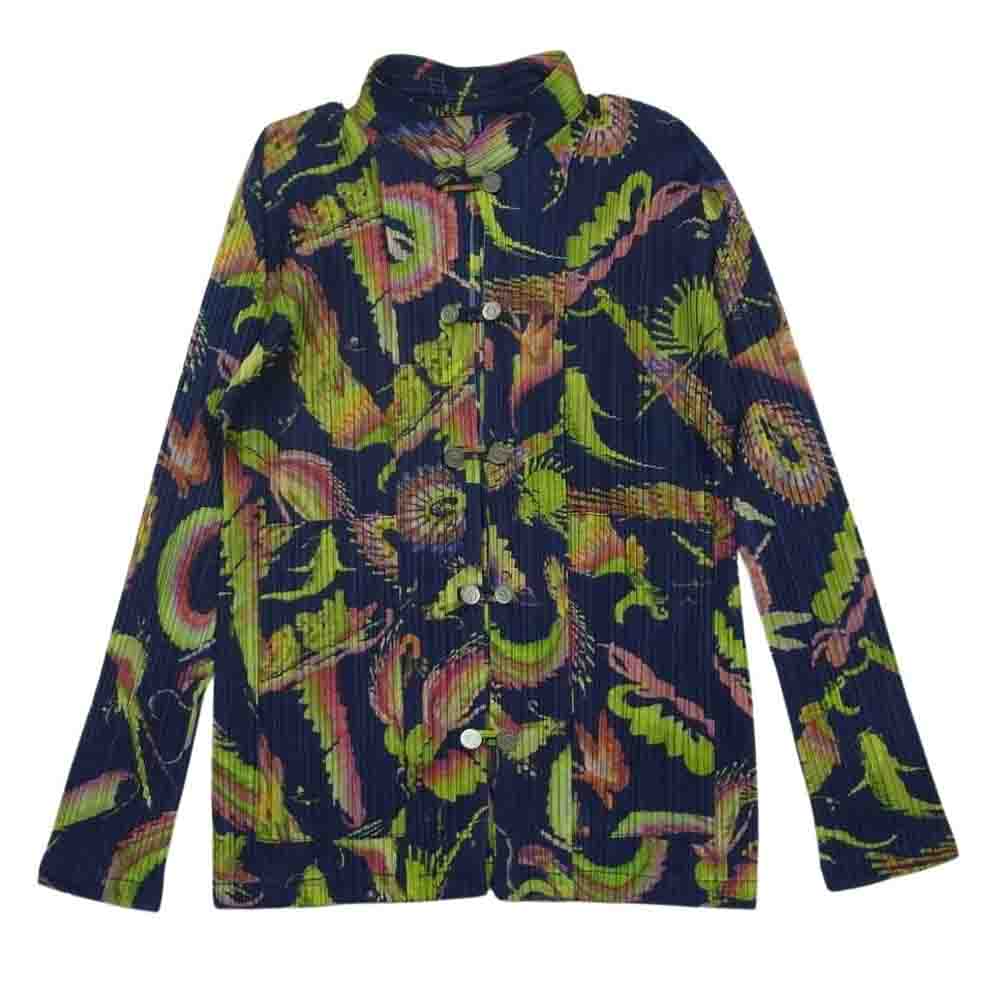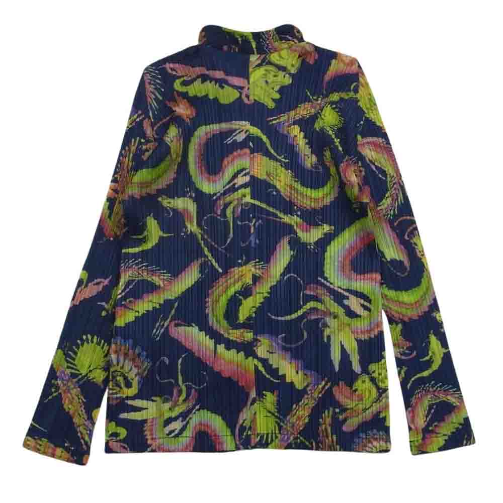 PLEATS PLEASE プリーツプリーズ イッセイミヤケ PP63-JD633 プリーツ加工 ドラゴン 龍 スタンドカラー チャイナ ボタン シャツ ネイビー系 4【中古】
