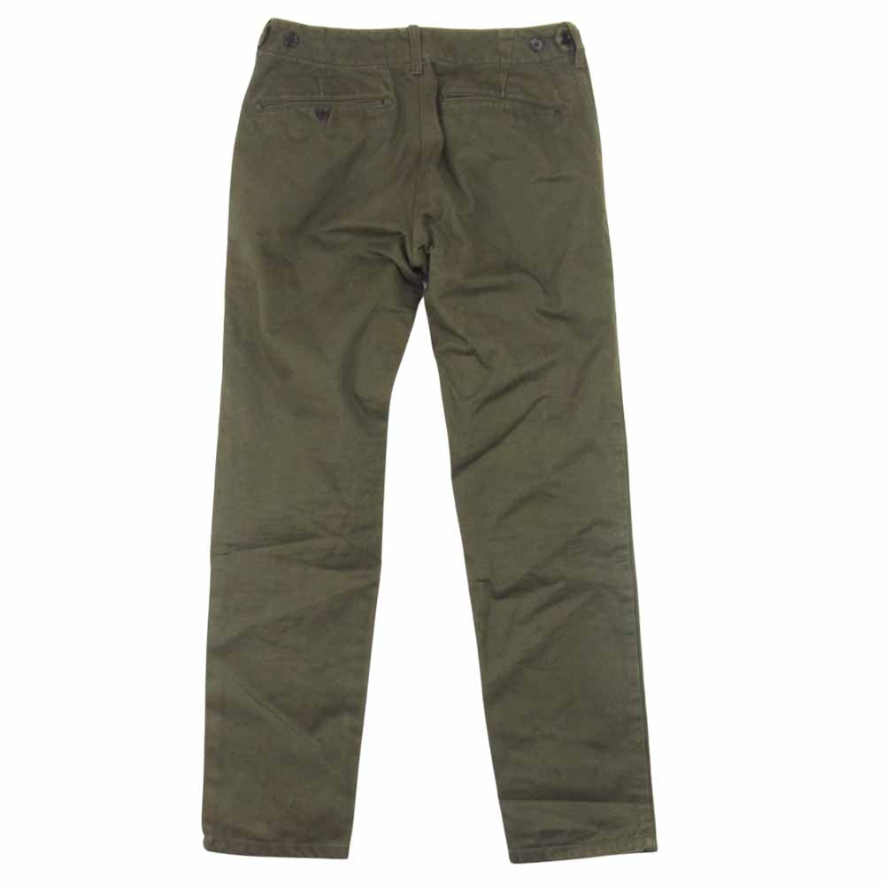 | 張りのあるチノ素材で重量感あります。 通常の使用感ございますがまだまだお使い頂けるオススメアイテム。 カーキでシンプルなデザイン、どんなコーデにも合わせやすいオススメパンツ! |