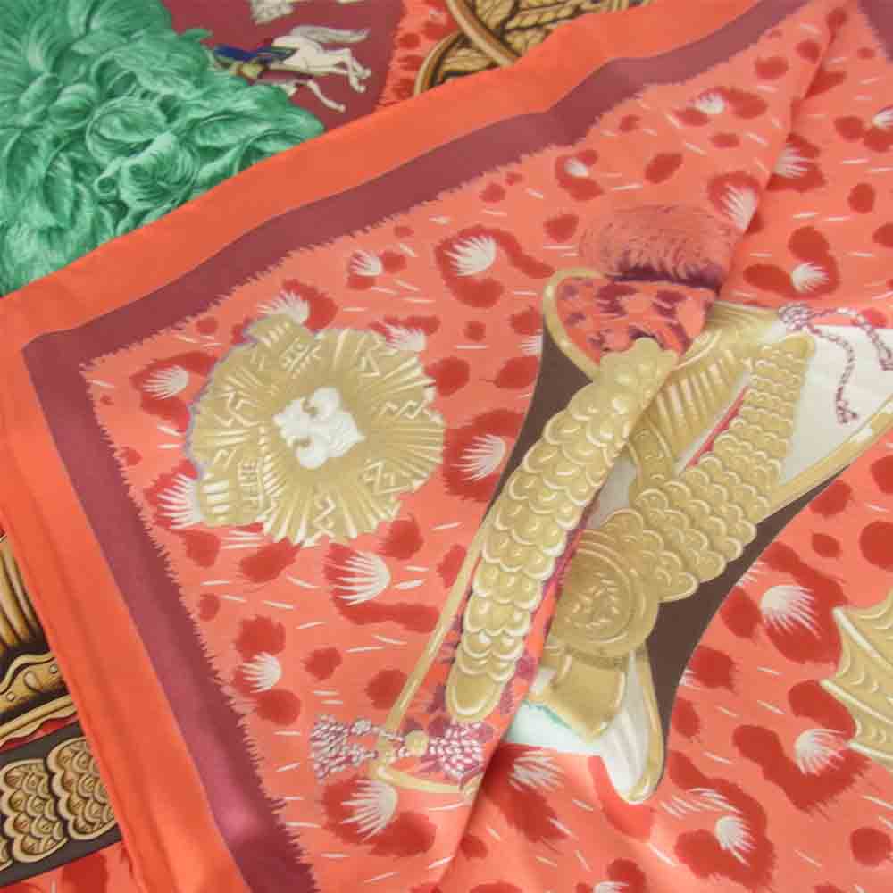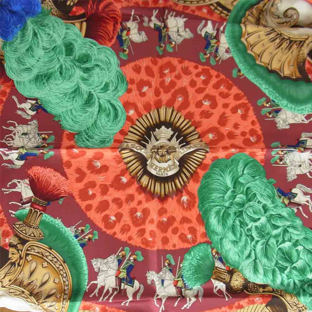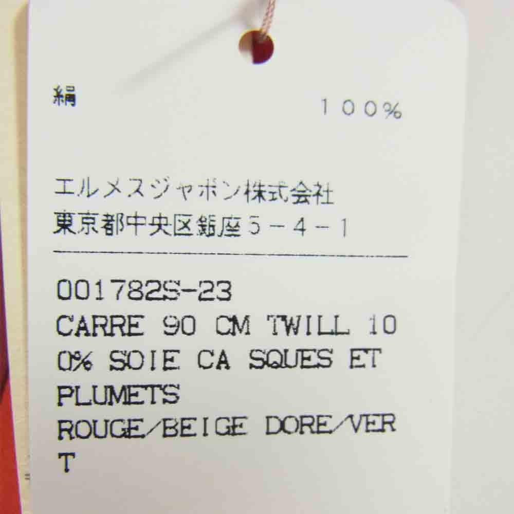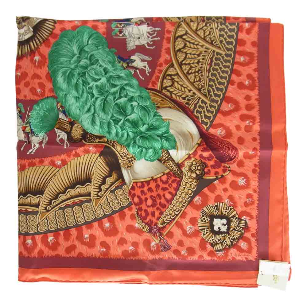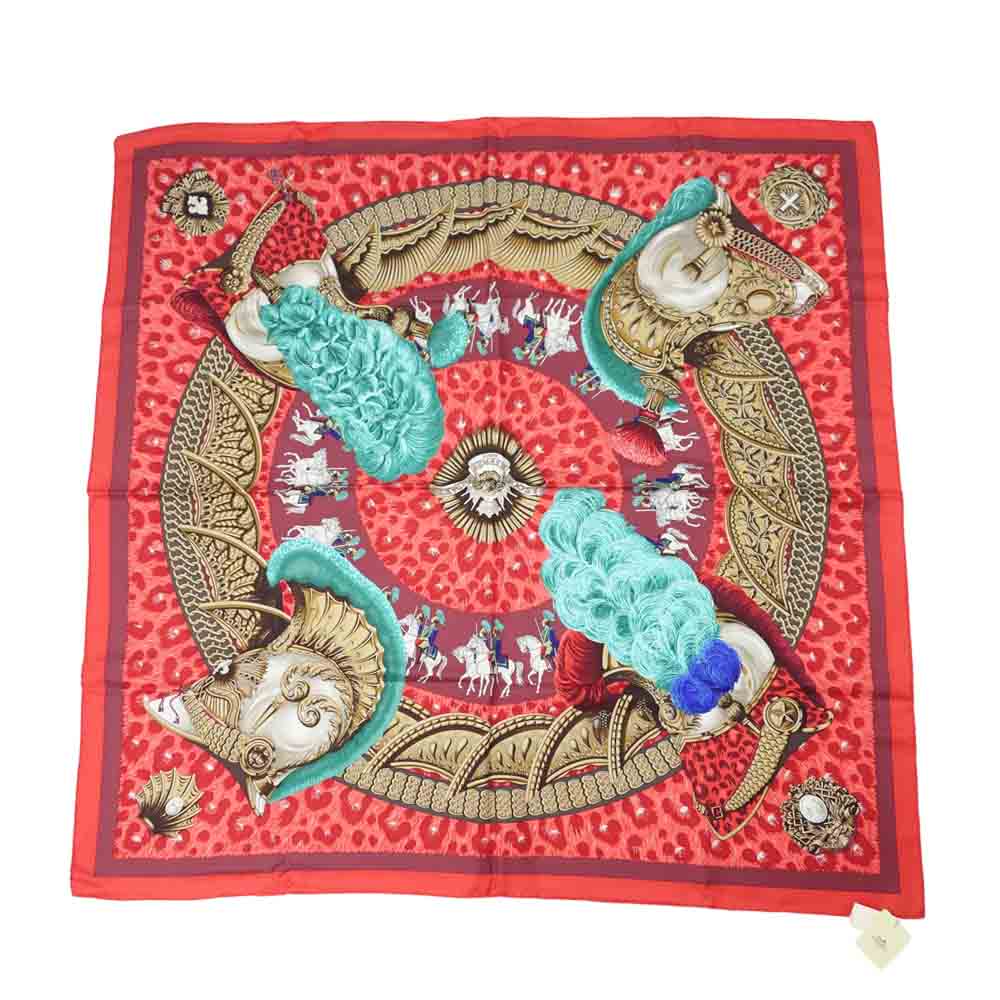 HERMES エルメス CASQUES et PLUMETS カレ 90 表情のない金兜 チーフ スカーフ レッド系 90cm【新古品】【未使用】【中古】