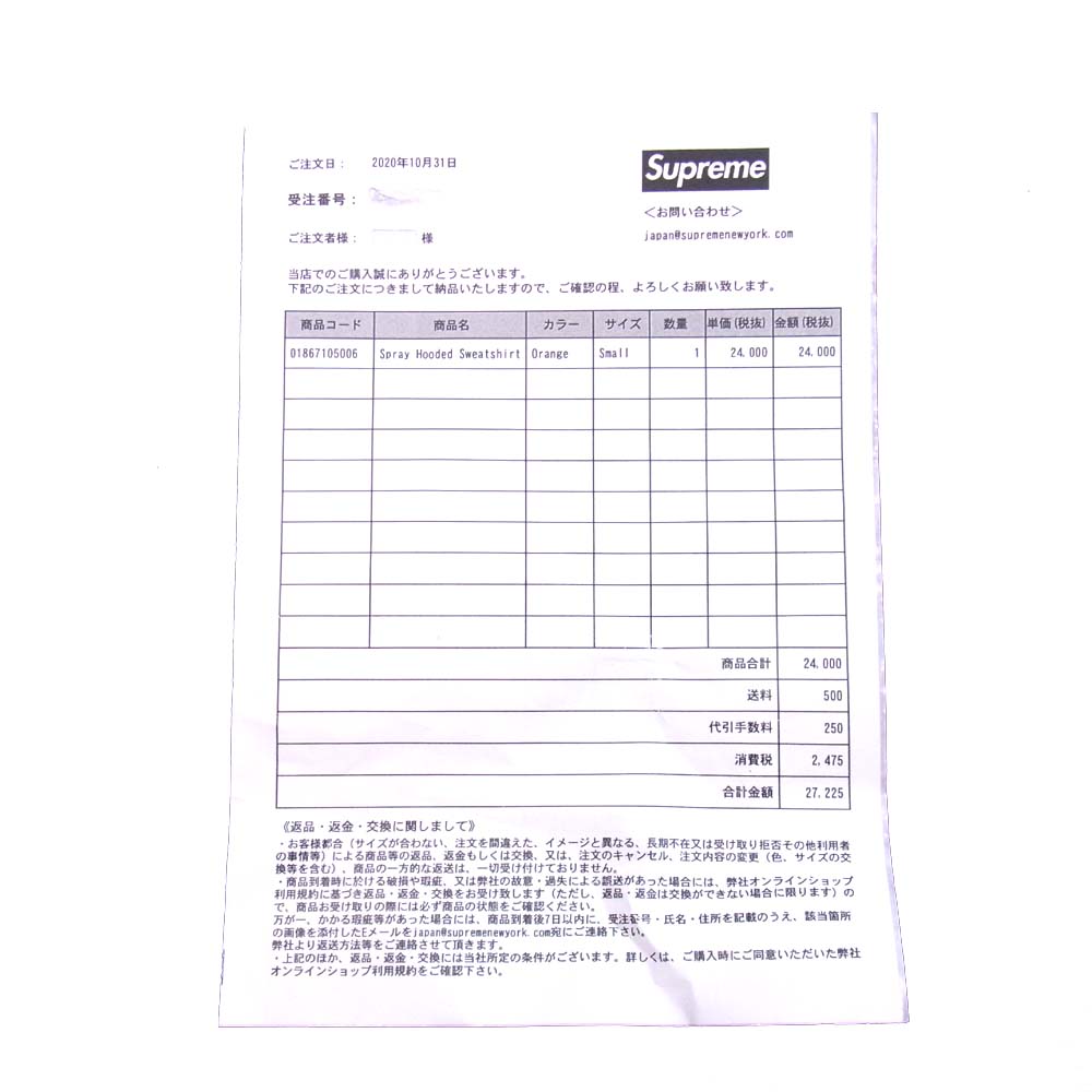 Supreme シュプリーム 20AW Spray Hooded Sweatshirt スプレー フーデッド スウェット パーカー オレンジ系 S【新古品】【未使用】【中古】